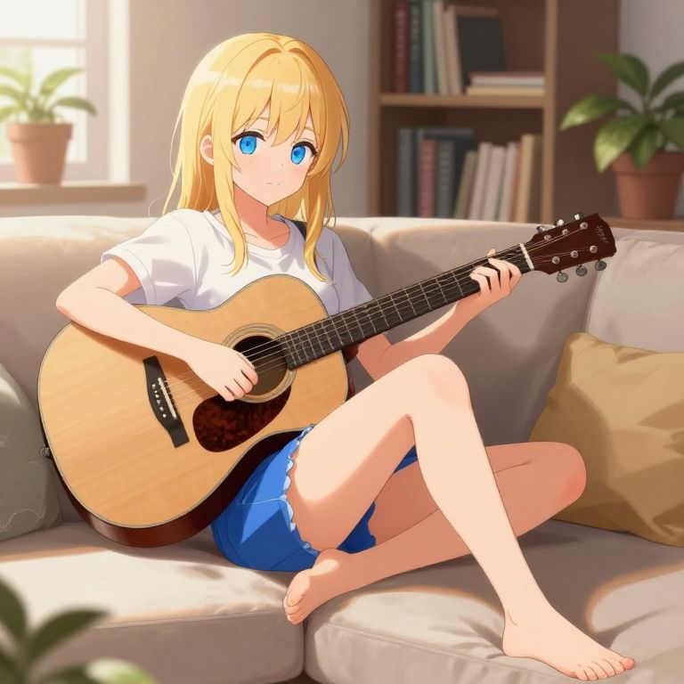 Digital art, anime style, blonde girl, blue eyes, acoustic guitar, sitting on couch, bare feet, white t-shirt, blue skirt, bookshelf background, potted plant, sunlight through window, relaxed pose