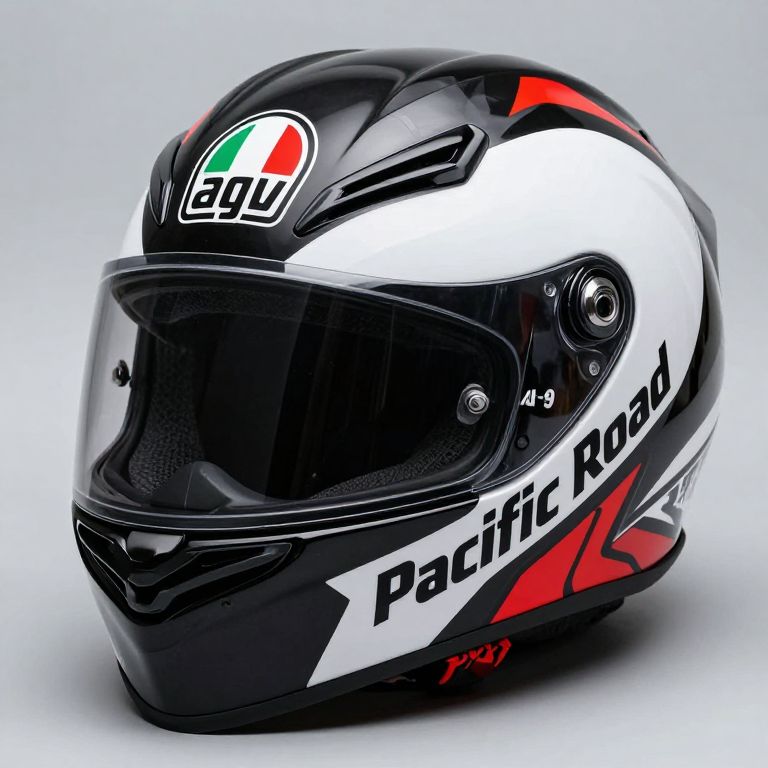 AGV AX-9 Pacific Road helmet featuring a sleek black, white, and red design with a prominent AGV logo above the visor and a bold \"Pacific Road\" text along the side, complemented by a stylized red graphic near the chin area.