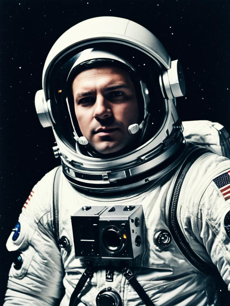 Man in Astronaut Costume, waist-up editorial portrait, photorealistic tones