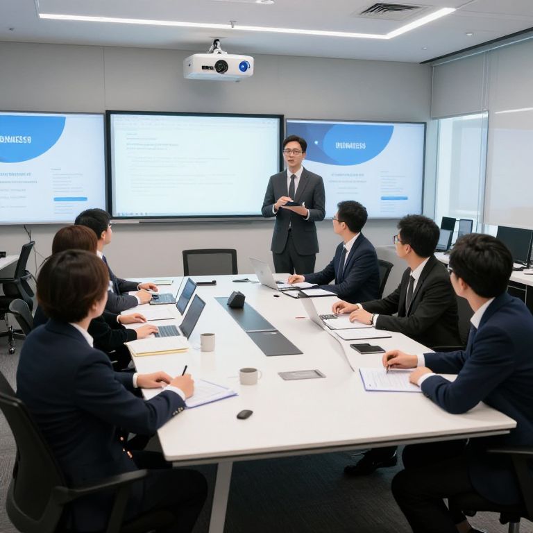 Photograph of a modern, well-lit conference room with six Asian men in dark suits seated around a white rectangular table. A projector screen in the background displays a blue and white presentation slide. The central speaker stands at the front, gesturing with his hands. The room features gray walls, ceiling-mounted camera, and large windows with blinds. Each man has a laptop, notepad, and pen, with a black chair at each place. The atmosphere is professional and focused.
