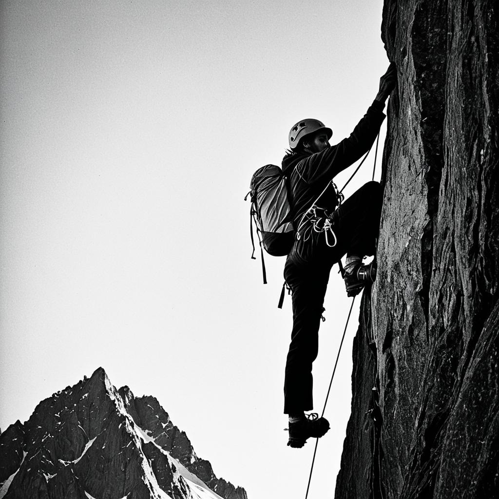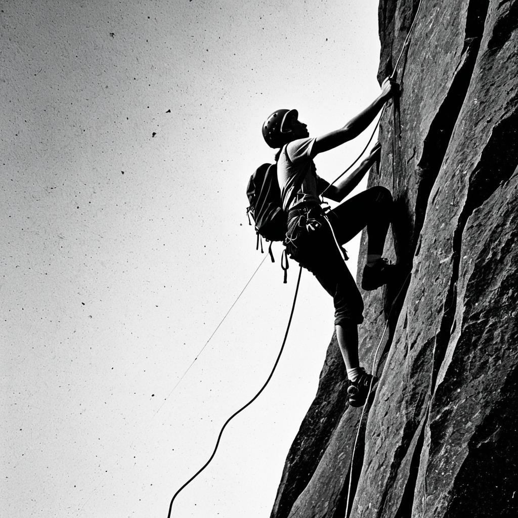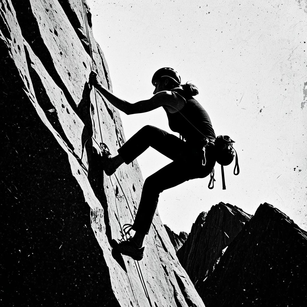 Black and white silhouette of a female rock climber ascending a steep rock face. She is equipped with climbing gear, including a helmet, harness, ropes, and climbing shoes. The image captures the intensity and concentration of outdoor rock climbing.