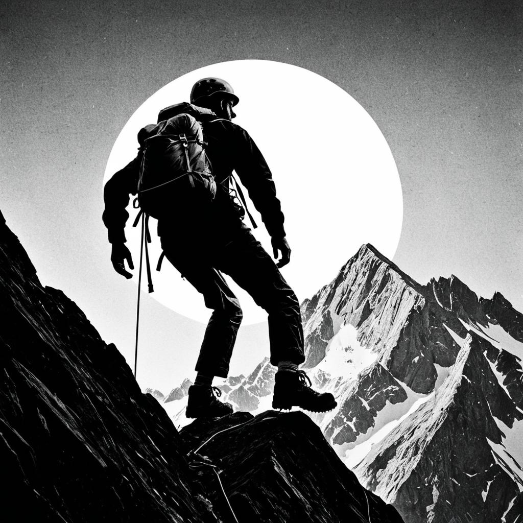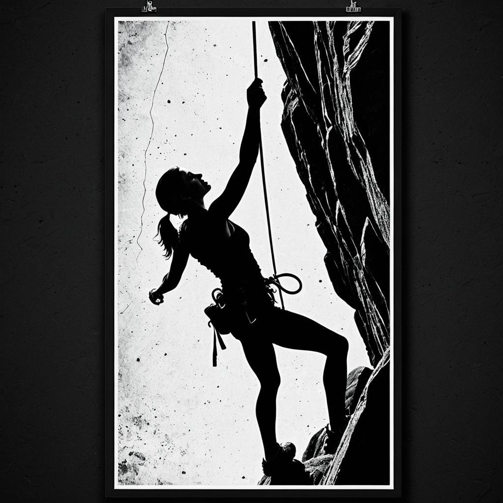 Vintage poster of a skilled rock climber rock climbing. Rendered in black and white with a retro aesthetic, the composition is minimalist and bold, emphasizing dramatic lighting, high contrast, and an adventurous spirit in a timeless, striking silhouette.
