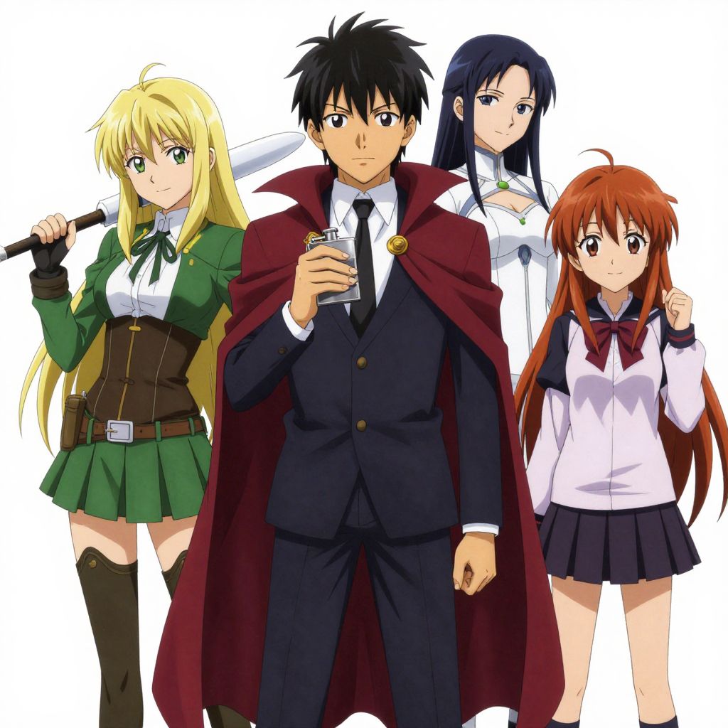 Four anime-style characters stand together, featuring a central figure in a dark suit and red cape holding a flask, flanked by three individuals: a blonde woman in green attire to the left, a red-haired girl in a school uniform to the right, and a long-haired woman in white clothing behind her, all set against a plain background.