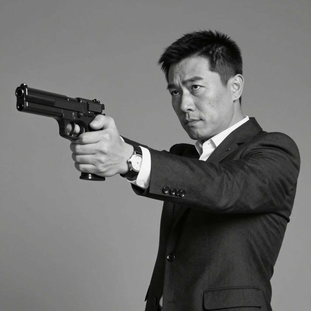 Black-and-white photograph of a focused Asian man wearing a dark suit, white shirt, and black tie. He is holding and aiming a black handgun with both hands, standing indoors in front of a closed plain door with a metal handle. The image captures a tense and serious moment.