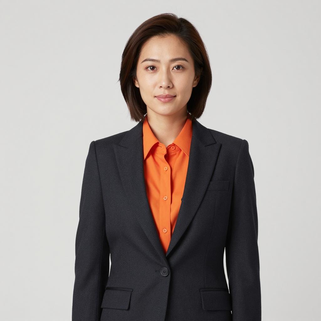 Portrait of an Asian professional woman with straight dark hair wearing a dark blazer over a bright orange button-up shirt. She looks confidently at the camera against a plain light grey background, representing modern business professionalism and empowerment.