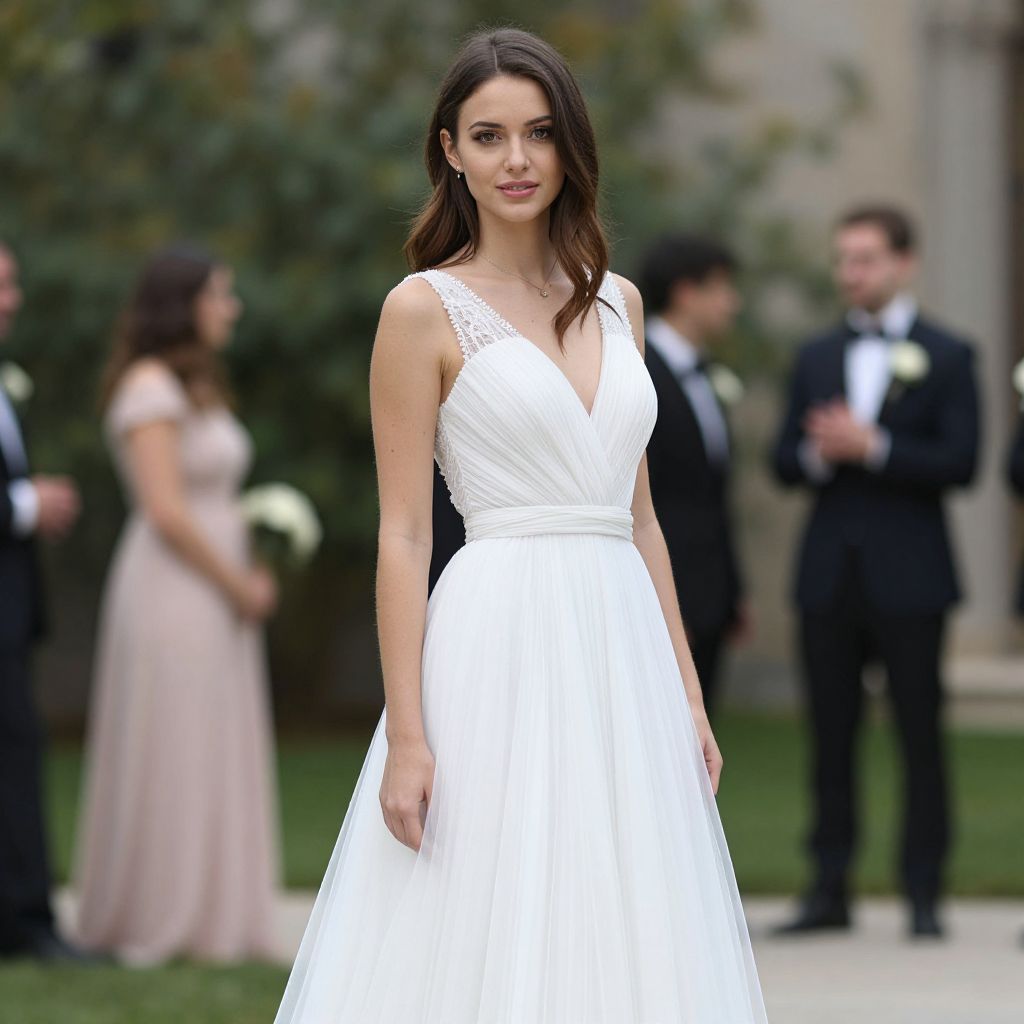 Beautiful party wear gown, 1girl, solo, dress, brown hair, white dress, long hair, blurry, blurry background, outdoors, looking at viewer, flower, sleeveless, standing, sleeveless dress, brown eyes, breasts