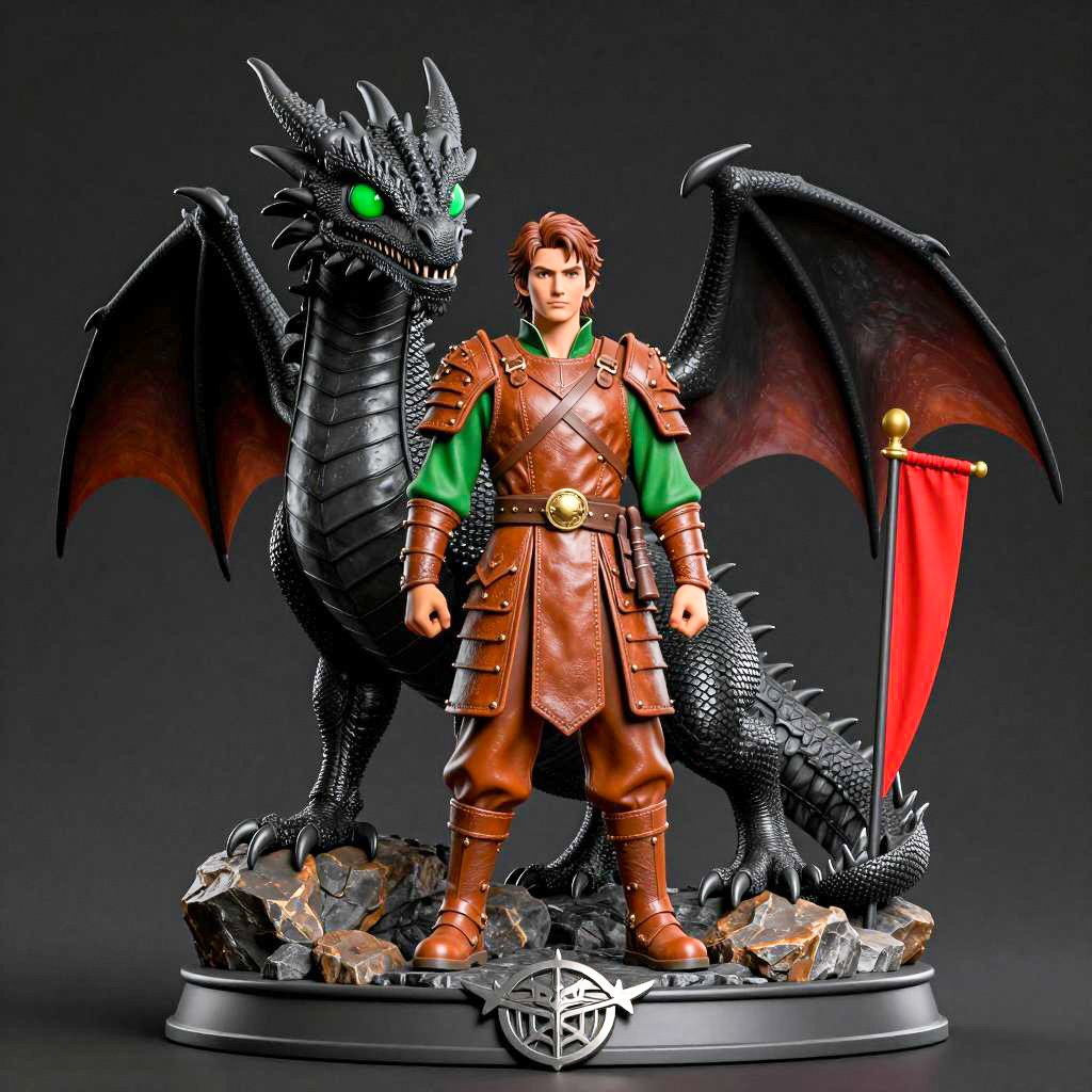 Photograph of a male figure statue. Wearing a large, ured black cloak, brown quilted leather tunic, and matching gloves. Dark brown pants and boots. Short black hair, serious expression. Dark background. Standing on a circular pedestal. Dark, muted color palette. Realistic style. Cloak draped over shoulders, tunic cinched at waist, sword sheath visible on right side.