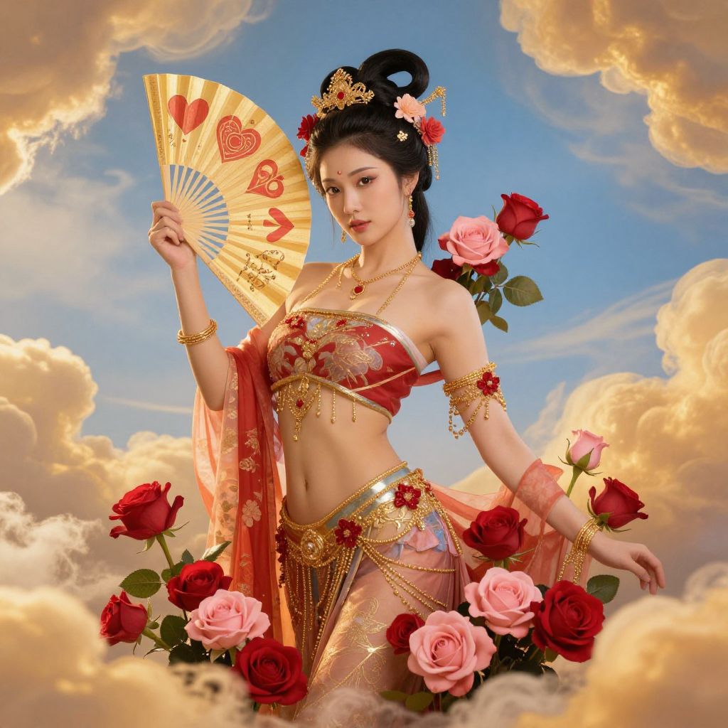 Asiangoddessoflove shown as a mythical goddess surrounded by delicate red and pink roses, holding a fan decorated with symbols of love and harmony, her elegant pose framed by golden clouds and a serene blue sky, capturing a sense of divine romance.
