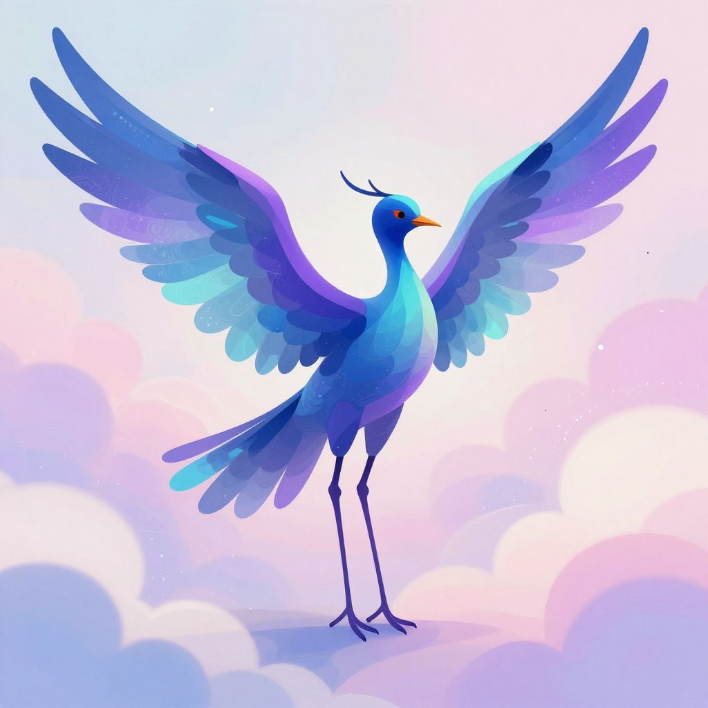 Digital artwork of an abstract fantasy bird with large colorful wings in shades of blue, purple, and teal. The bird stands tall with a slender body and long legs, set against a dreamy pastel background featuring soft clouds and floating dots that create a magical, ethereal atmosphere.