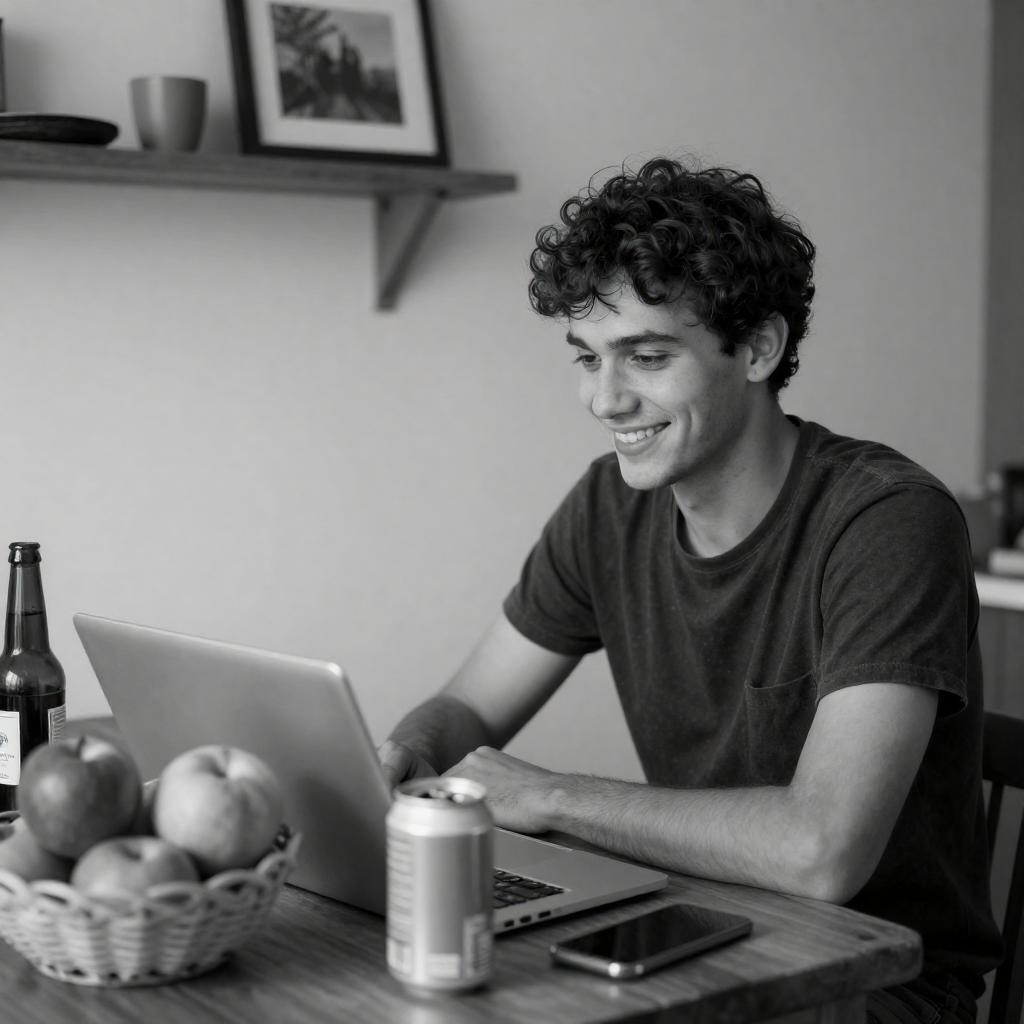 Black-and-white photograph of three men at a bar. The central man with dark hair and a suit looks at a laptop, while the man on the left, wearing a cap, leans in, and the man on the right, with curly hair, smiles. The bar counter has bottles and condiments. Bright lights illuminate the scene.