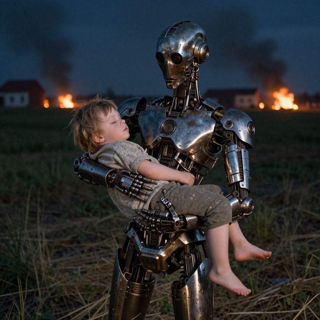 Photograph of a shiny, metallic robot holding a smiling, barefoot toddler with messy hair at dusk, with burning houses in the background.
