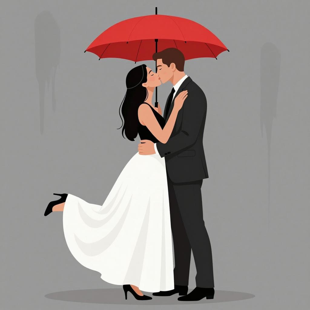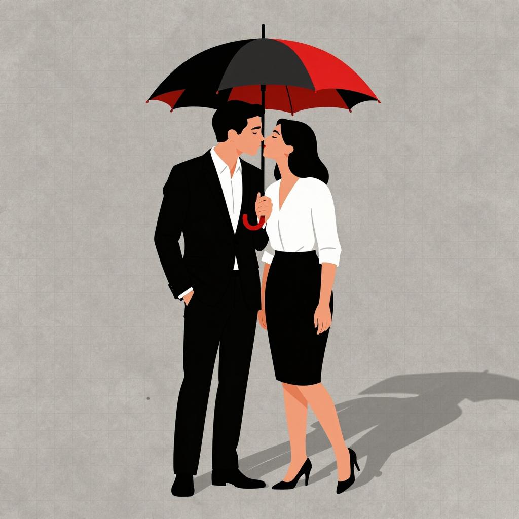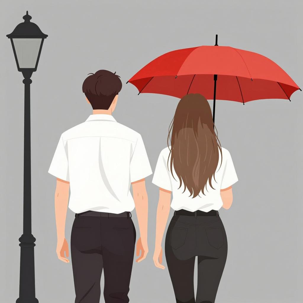 Two people with back views, walking together. The person on the left has short dark hair, the person on the right has long light hair. Both wear white shirts and black pants. The right person holds a bright red umbrella. A black street lamp is on the left. The background is filled with in a grayish tone. The style is a digital illustration with a mixed media ure.