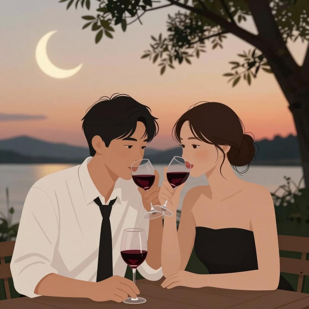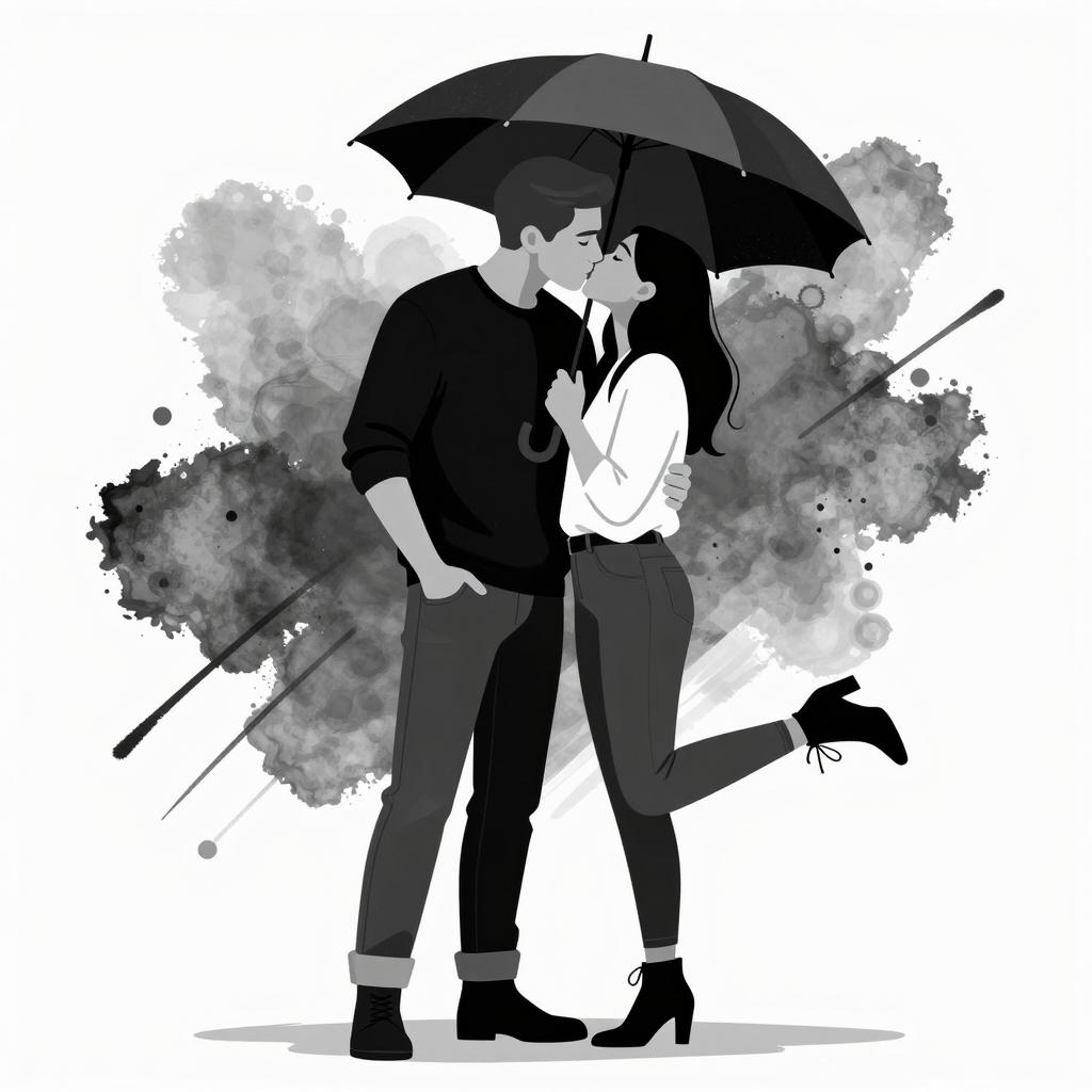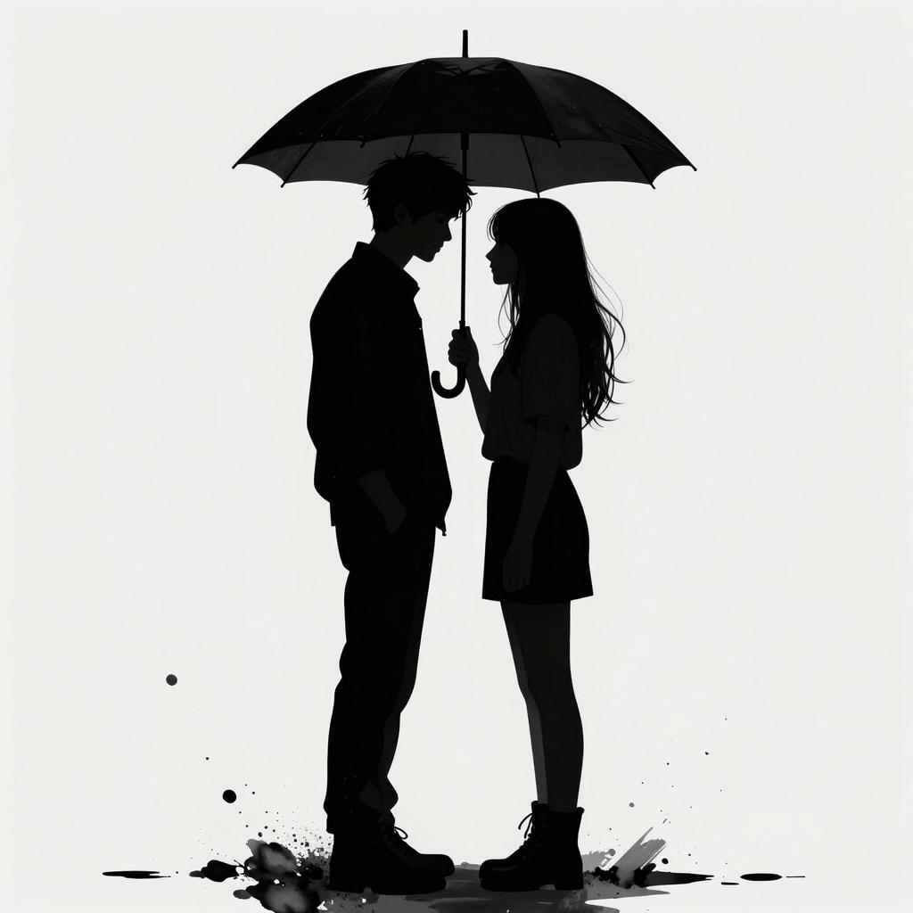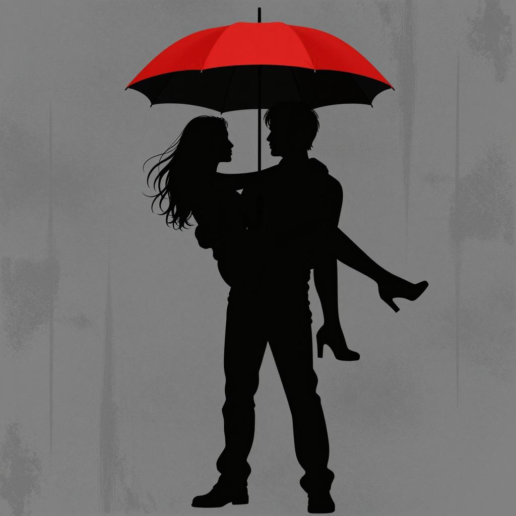 Two people with back views, walking together. The person on the left has short dark hair, the person on the right has long light hair. Both wear white shirts and black pants. The right person holds a bright red umbrella. A black street lamp is on the left. The background is filled with in a grayish tone. The style is a digital illustration with a mixed media ure.