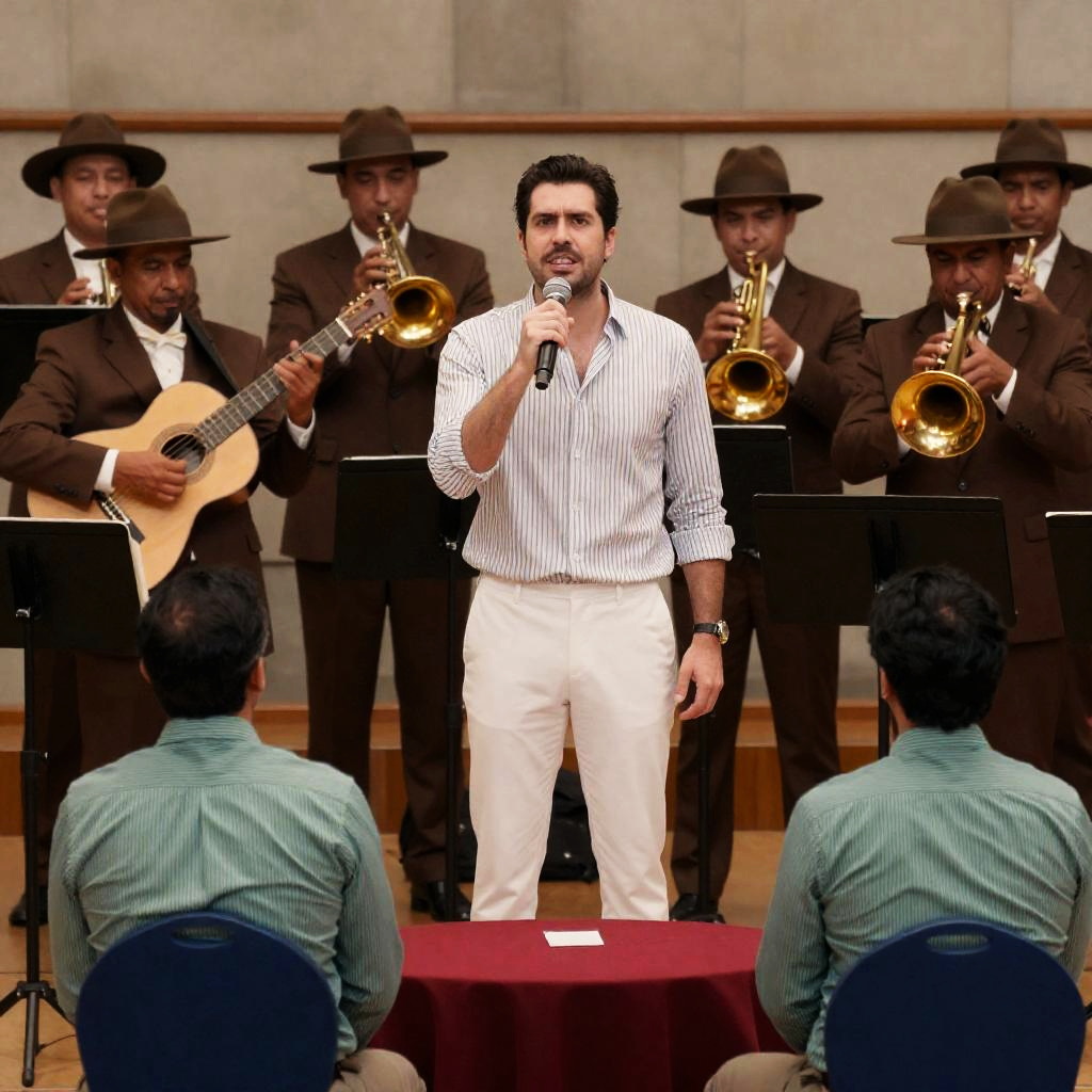 Photograph of a musical performance. Male singer in striped shirt and white pants stands center, intense expression. Seven male musicians in brown suits with large hats stand behind, playing guitars and brass instruments. Two men in green and striped shirts sit in front, looking at singer. Red table with blue cloth in foreground. Stone wall and wooden railing in background.