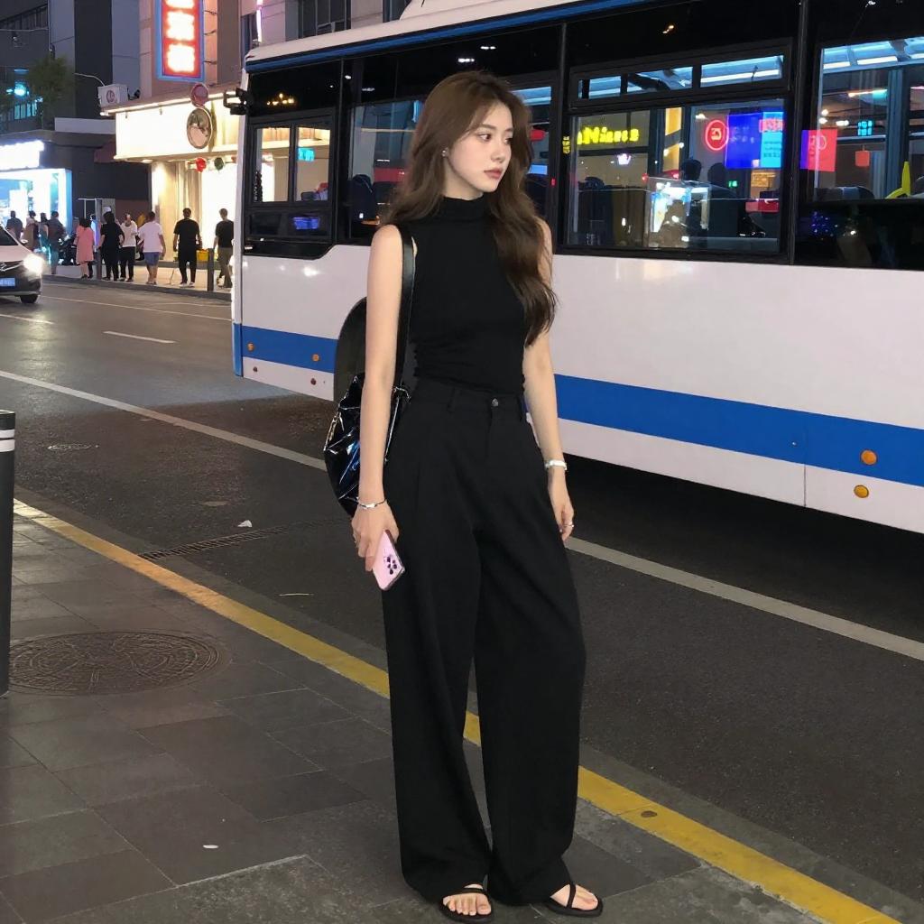 Photograph of an Asian woman with long brown hair, wearing a black sleeveless top and high-waisted black pants, standing on a city street