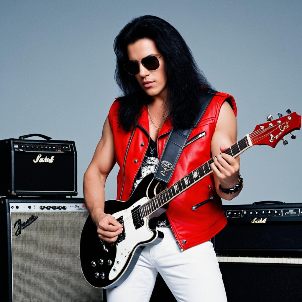 Portrait of a male rock musician with long black hair wearing sunglasses, a red leather sleeveless vest, a black graphic shirt, and white pants. He is standing and playing a black and white electric guitar in front of guitar amplifiers, creating a realistic music performance scene.