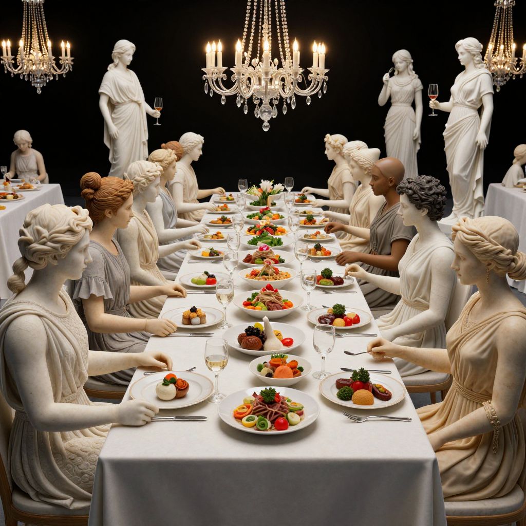A surreal 3D-rendered banquet scene features rows of suspended marble statues, frozen mid-meal, dressed in classical attire, dining on vibrant dishes that blend modern and historical elements, illuminated by elegant chandeliers in a dramatic, timeless setting.