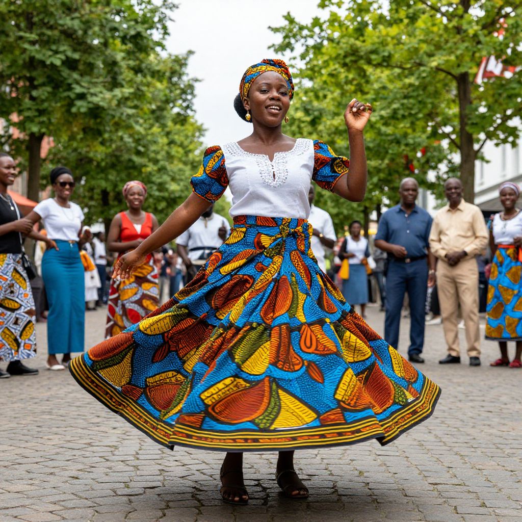 Woman twirling vibrantly in a traditional Nigerian outfit during a cultural event in Germany, her colorful skirt radiating outward as she dances joyfully on a cobblestone street lined with green trees and onlookers.