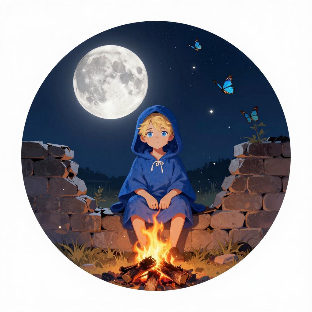 This digital anime-style illustration features a young boy with blonde hair and blue eyes, sitting on a stone wall at night. He wears a blue hooded cloak, and his expression is calm. A bright, full moon dominates the dark, starry sky behind him. To the right, two blue butterflies fly near a plant with blue flowers. The boy sits in front of a small, glowing campfire, casting a warm light on his legs and the grass below. The circular frame around the scene emphasizes the nighttime setting and the contrast between the moon's white light and the dark sky.
