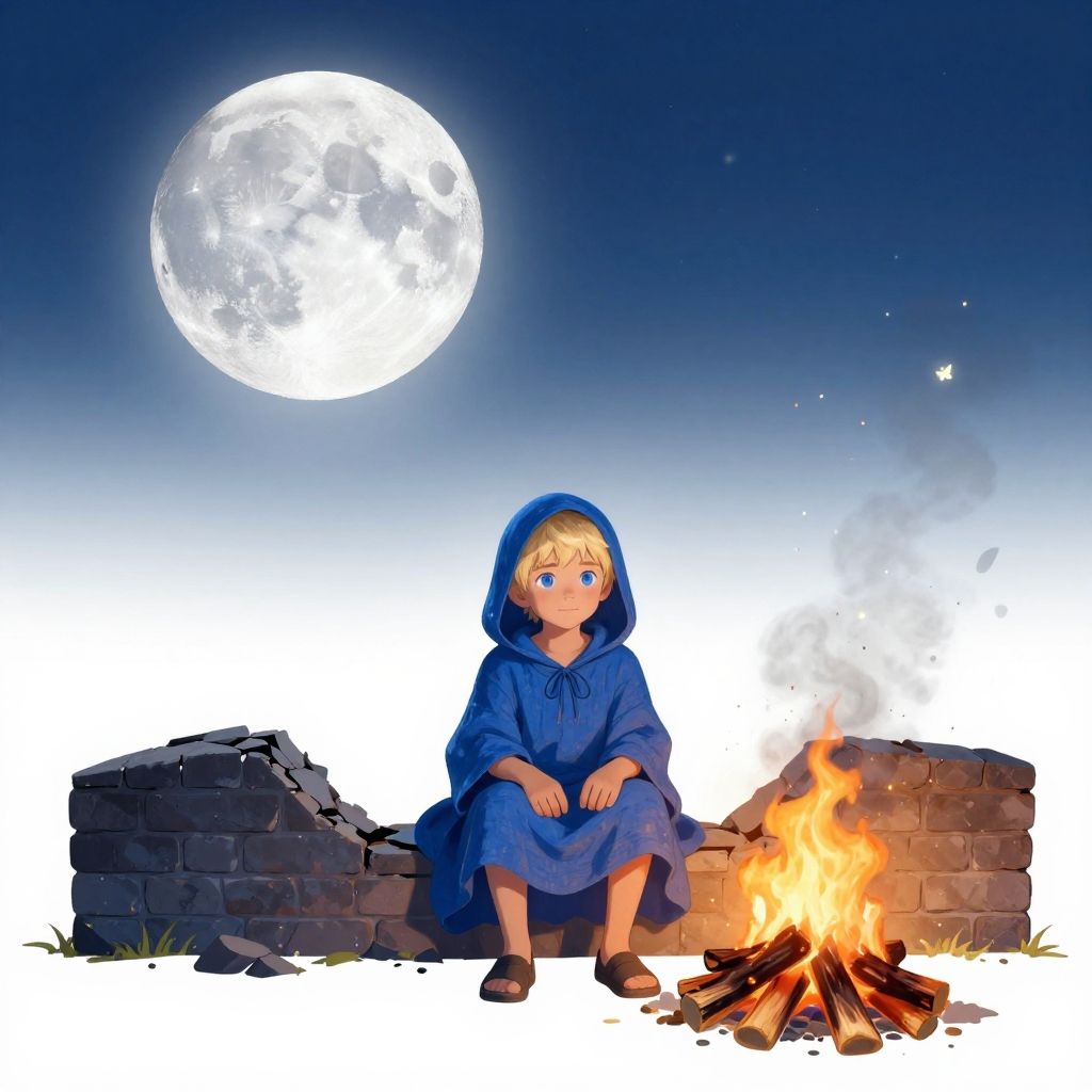 Digital illustration of a blonde boy in a blue hooded robe sitting by a campfire under a full moon, with butterflies flying in the night sky,