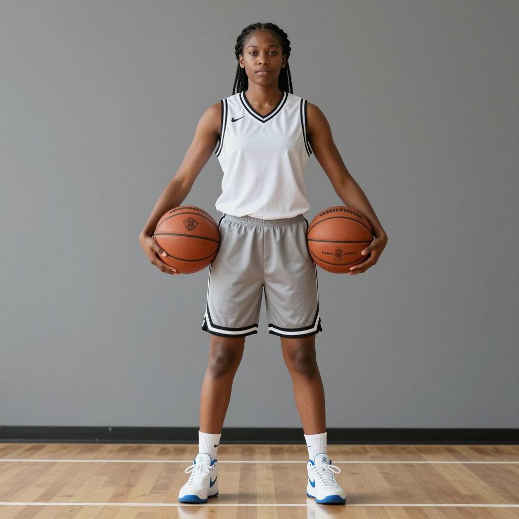 Basketball pants, photograph of a black woman standing on a basketball court, wearing a white sleeveless basketball jersey, grey basketball shorts with black trim, white sneakers with blue accents, holding two basketballs, medium-length black braids, neutral grey background, wooden floor, full body shot, athletic pose, simple lighting, realistic style