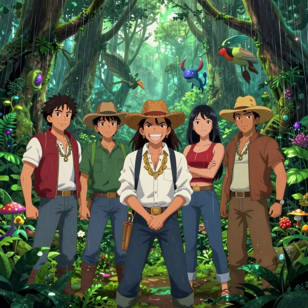 Digital anime-style illustration: Tall, bearded man in black suit and hat stands center, flanked by six young men in casual clothing on a sun
