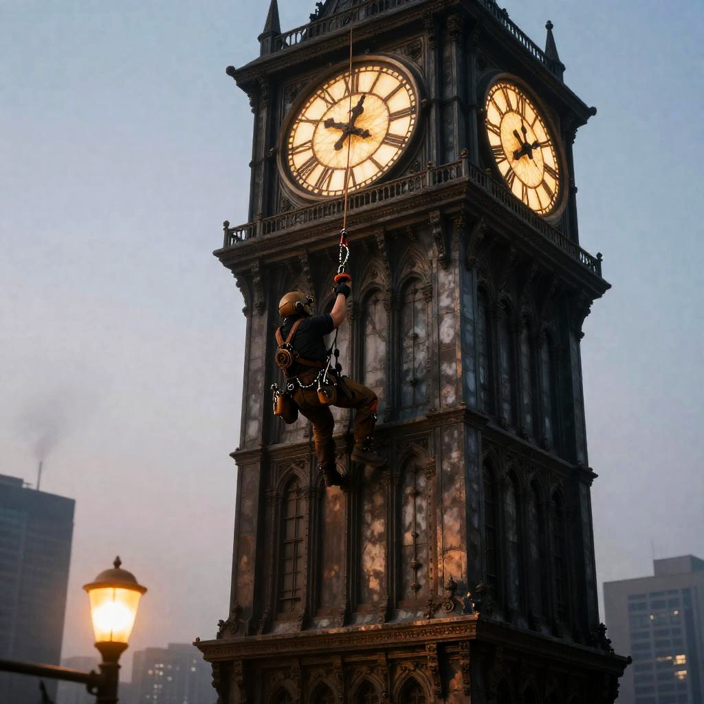 Daring Steampunk Mechanic Scaling Iron Clocktower