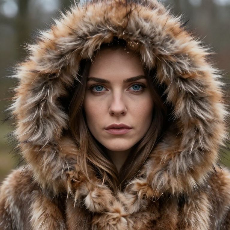 A person is wearing a brown fur coat with a furry hood. The person has blue eyes and has a serious expression.
