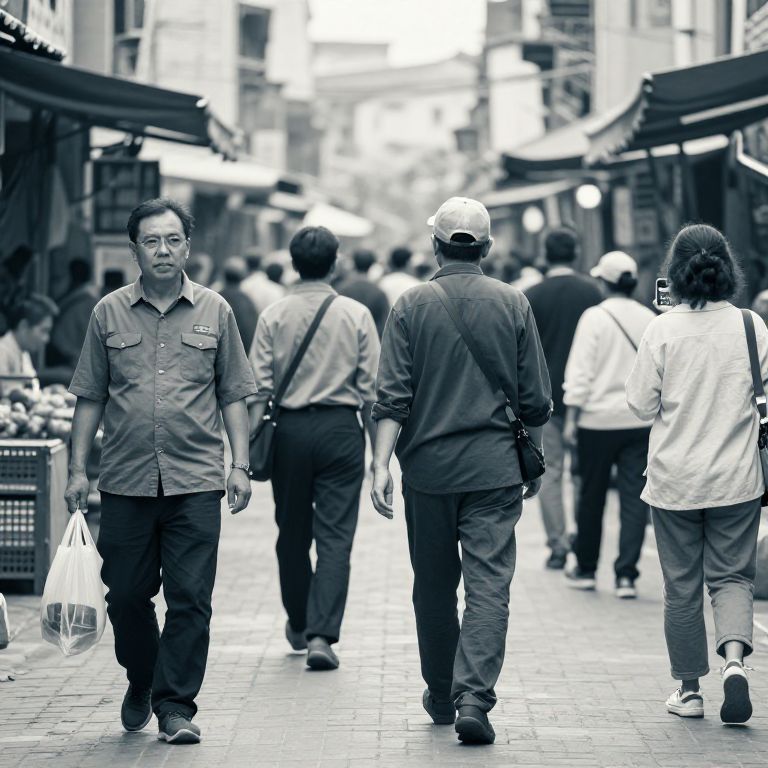 Monochrome street outfits styled in a bustling downtown marketplace, soft focus on people in uniform shades of blue, gray, and white, authentic urban environment, muted colors, grounded composition, Flux style with real-world detail.