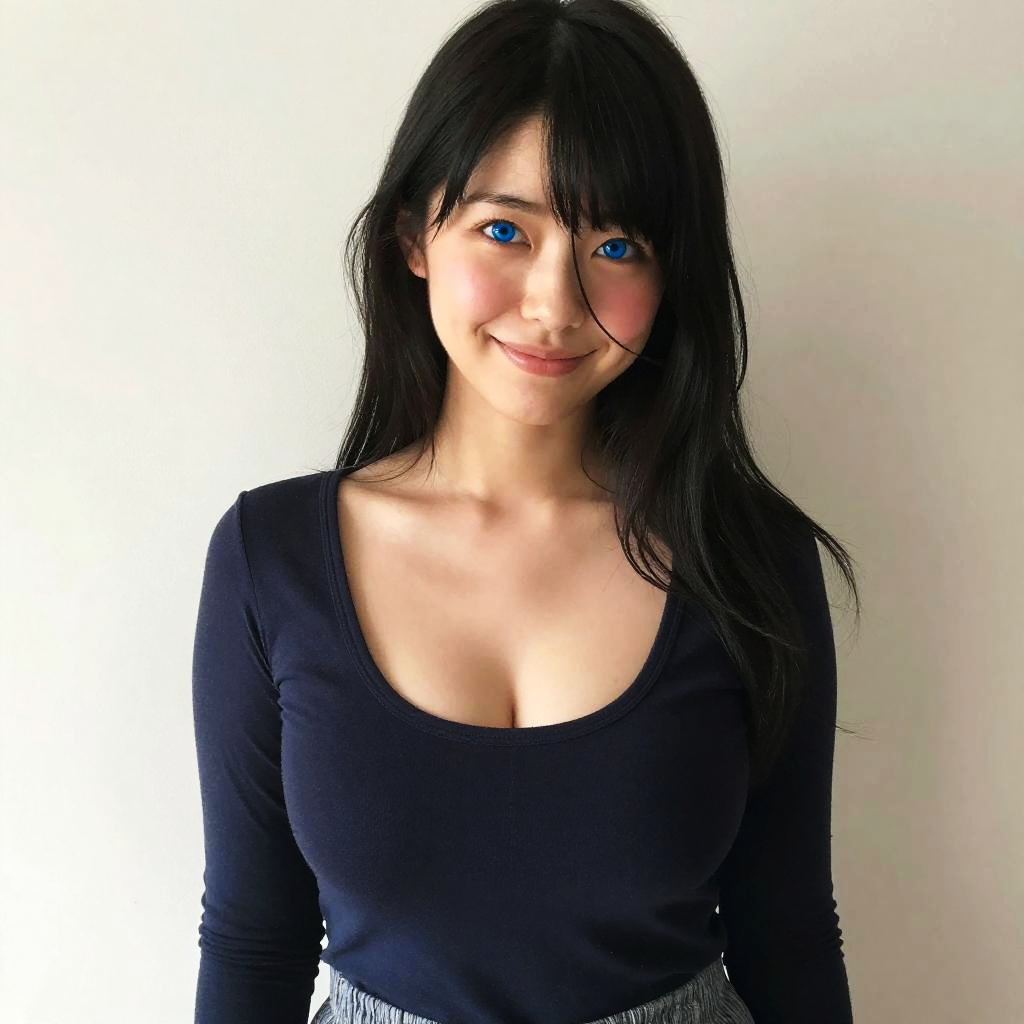 Masterpiece, (best quality), 1woman, 1girl, haruhiko_ichijou_mother, black hair, long hair, (blue eyes), casual clothes, (skirt), big breasts, sexy woman, smile, hair between eyes, long sleeves, closed clothes, embarrassed, blush, vibrant colors, natural lighting, RTX, beautiful, (detailed face:1.2), showcase, (perfect eyes:1.1), (photorealistic:1.1), 8k uhd, looking at viewer, indoors, simple backround
