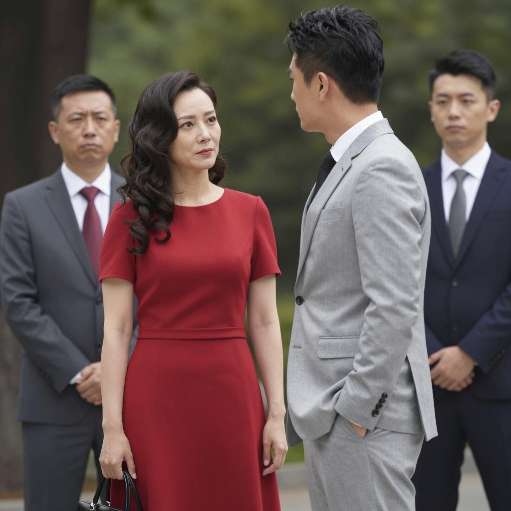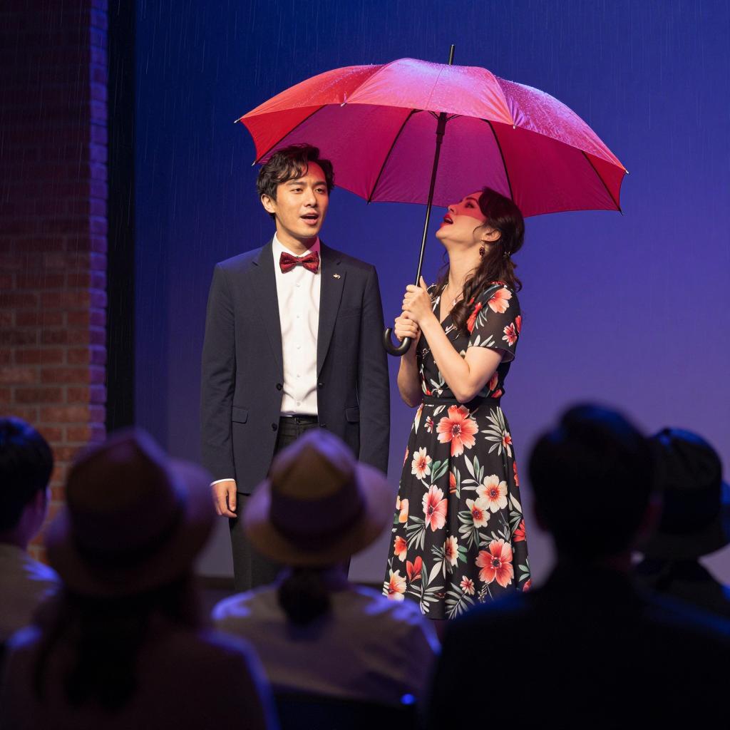 Photograph of a man and woman on stage. Man in light blue suit, white shirt, and patterned tie, standing right, gesturing with right hand. Woman with dark hair, playing red accordion, sitting left, looking up at man. Background: dark, with pink flowers and green leaves. Bright stage lights.