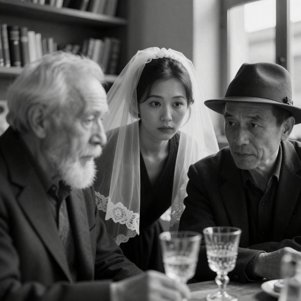 Black-and-white photograph of a man and woman standing beside a saddled horse. The man wears a checkered shirt, hat, and carries a bag. The woman wears a striped blouse, bowtie, and high-waisted skirt. Background shows trees and a truck. Man looks at woman, who looks at him. Horse on left. Both hold objects in their hands. Sparse, rural setting.
