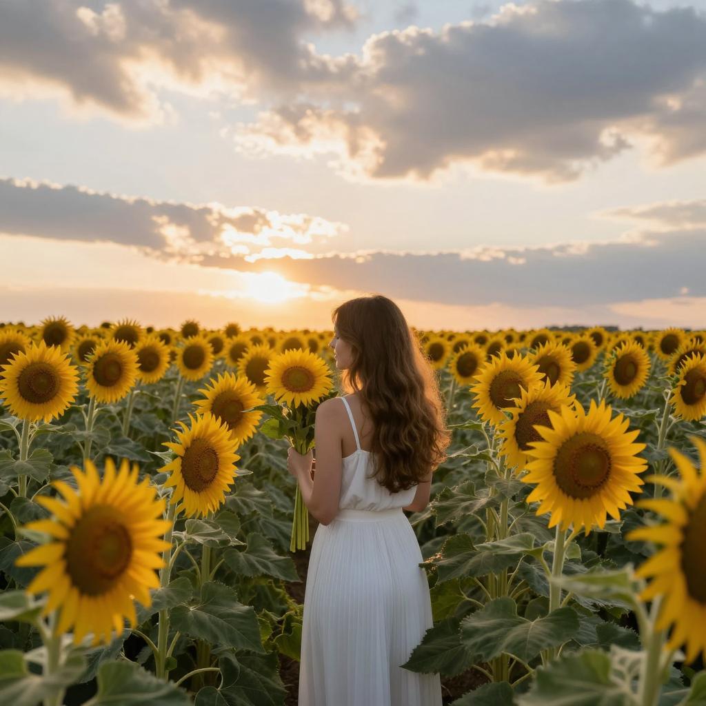 Woman with wavy blonde hair, off-shoulder white top, pink tulle skirt, and straw hat holds sunflower in golden wheat field. Birds fly in pink and blue sky. Small straw bag on right hip. Back view, standing in field.