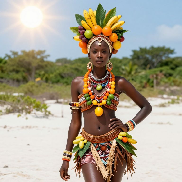 Photograph of a dark-skinned African woman in vibrant fruit-adorned headdress and jewelry, standing on a sunlit beach with greenery in