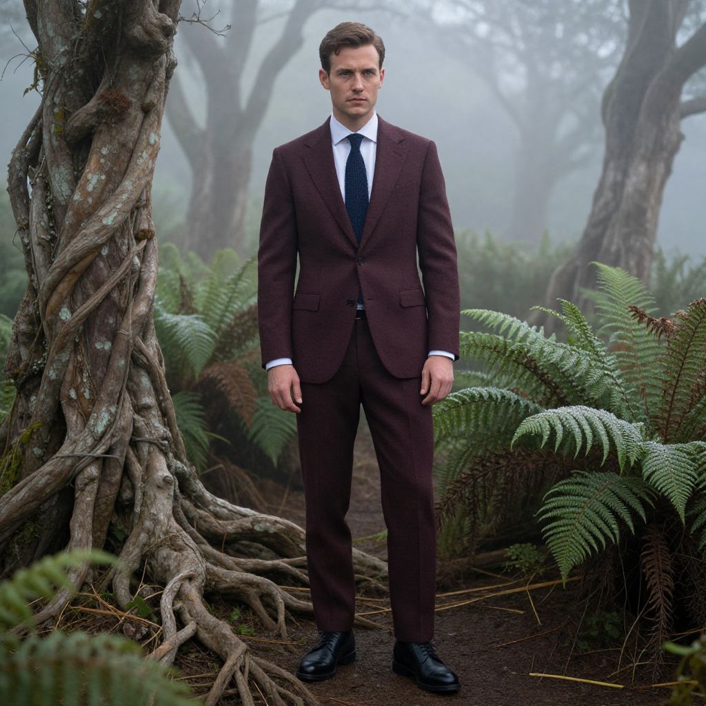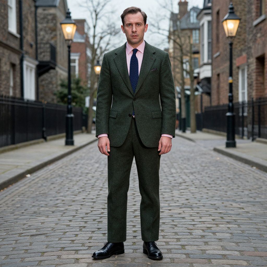 A man, dark green wool suit, pale pink dress shirt, textured navy tie, black leather derby shoes, cobblestone streets, Victorian architecture, gas lamps glowing, Cibachrome style, confident expression Man has masculine face and piercing eyes