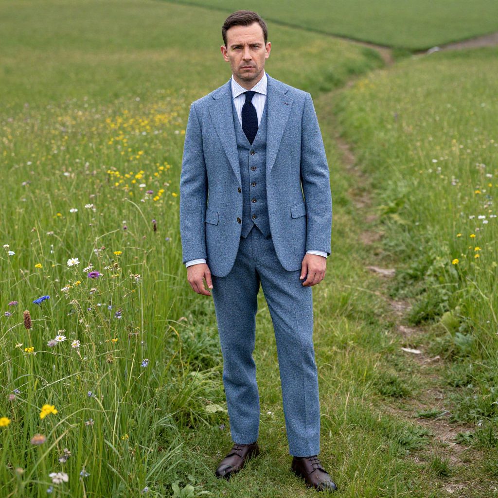 Photograph of a Caucasian man with short brown hair and glasses, standing on a cobblestone street in a quiet, urban neighborhood. He is wearing a dark green, textured, woolen suit with a white shirt and blue tie. His expression is neutral, and he stands with his hands at his sides. The background features brick buildings on both sides, black metal fences, and street lamps with glowing yellow lights. The sky is overcast, and the street is empty except for the man. The overall setting suggests a calm, residential area.