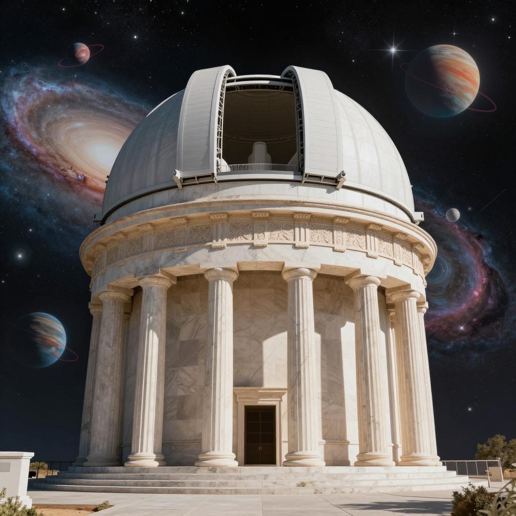 A futuristic space observatory inspired by ancient Greek architecture, featuring tall marble columns and intricate decorative friezes. The structure is set against a cosmic backdrop filled with swirling galaxies, distant nebulae, and various planets, blending classical design with deep space elements.