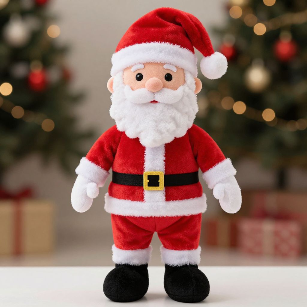 Regal santa adult plush, 1boy, solo, hat, male focus, santa costume, santa hat, gloves, christmas, white gloves, belt, full body, boots, standing, mustache, facial hair