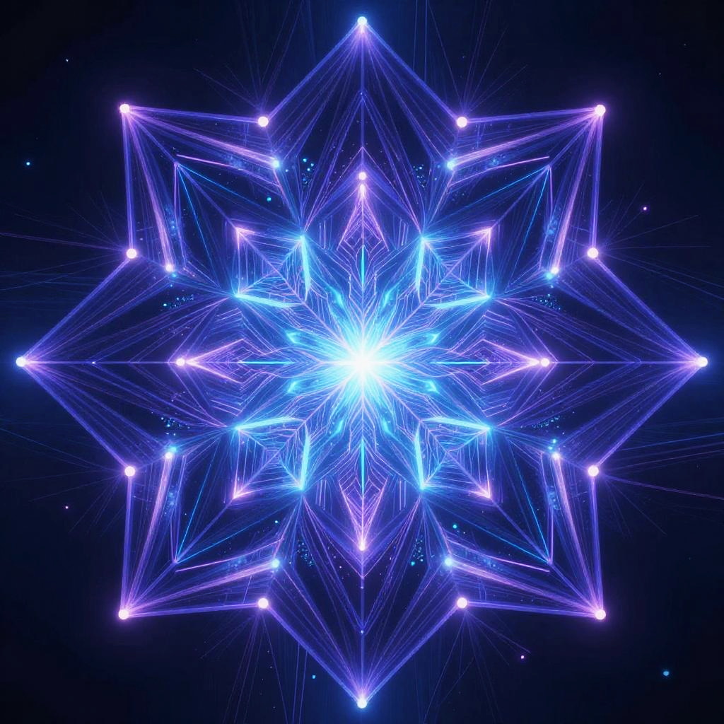 Digital art of a glowing blue geometric starburst pattern with bright white center, surrounded by neon purple lines and points on a dark blue background.