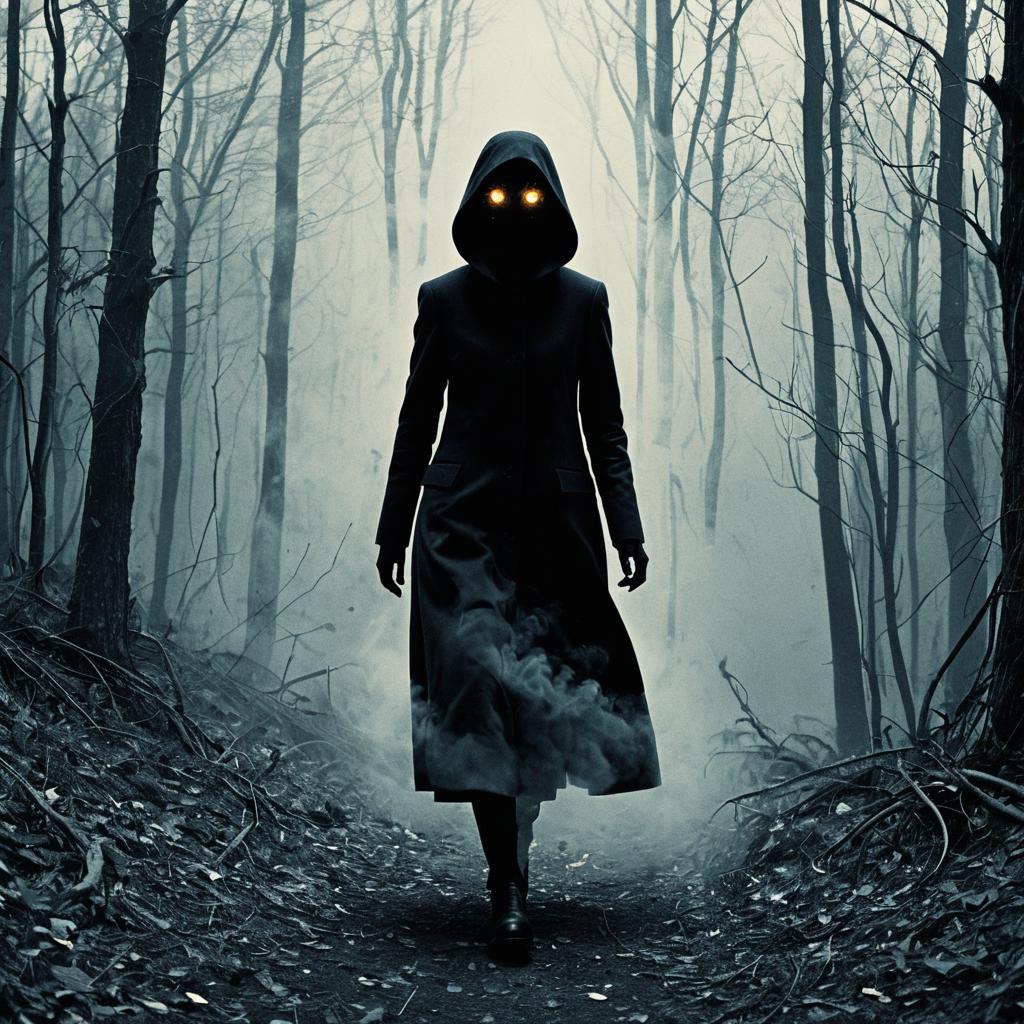 Mysterious Hooded Figure with Glowing Eyes in Foggy Forest