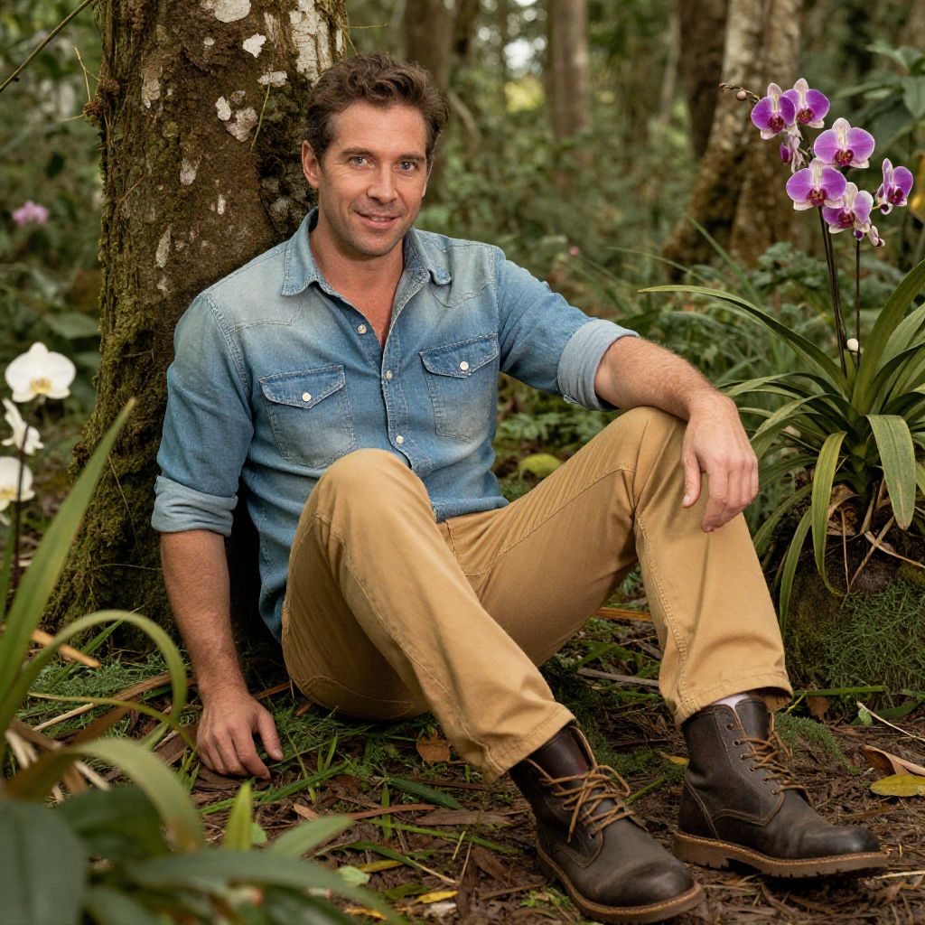 Photograph of a muscular, bearded man with short brown hair standing in a lush, tropical forest. He wears a slightly unbuttoned white dress shirt, olive green shorts, and brown sandals. The forest is dense with tall trees, ferns, and vibrant orchids in pink, white, and purple. The man's skin is tanned, and he stands confidently with his hands by his sides. The path beneath him is dirt, surrounded by rich green foliage. The lighting is natural, with soft sunlight filtering through the tree canopy.