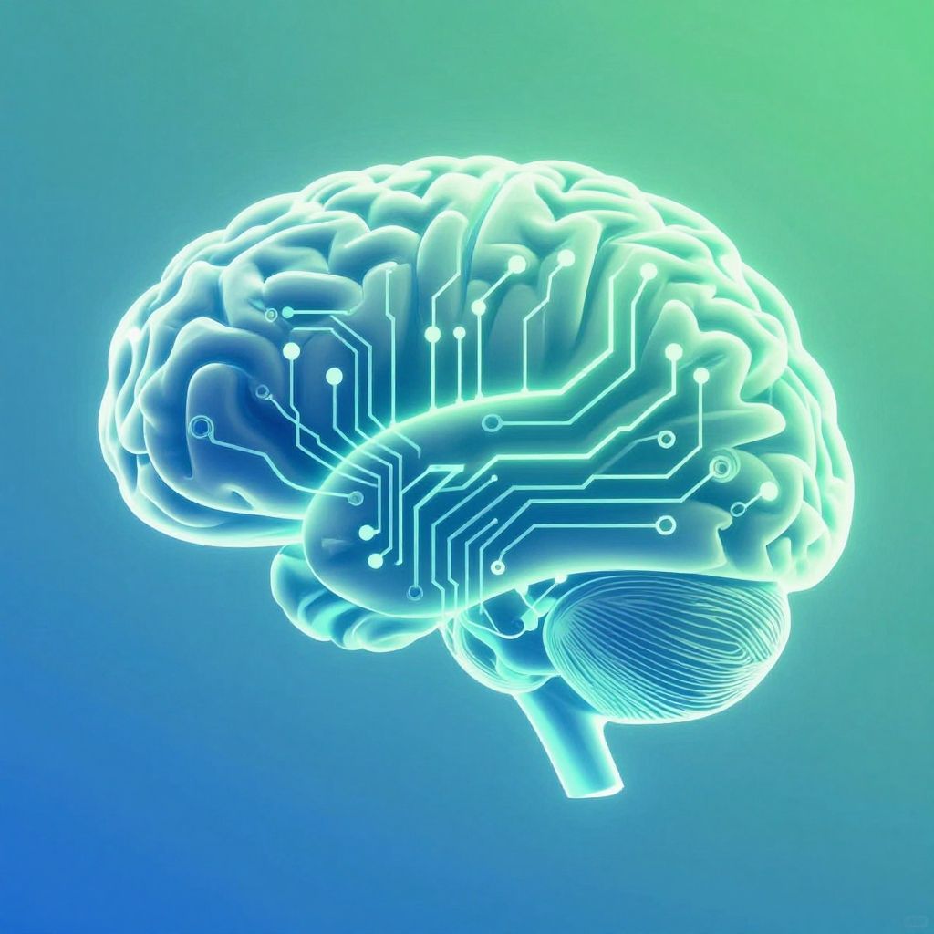 Neon blue and white wireframe 3D model of a human brain floating against a dark blue background, illuminated by glowing nodes.