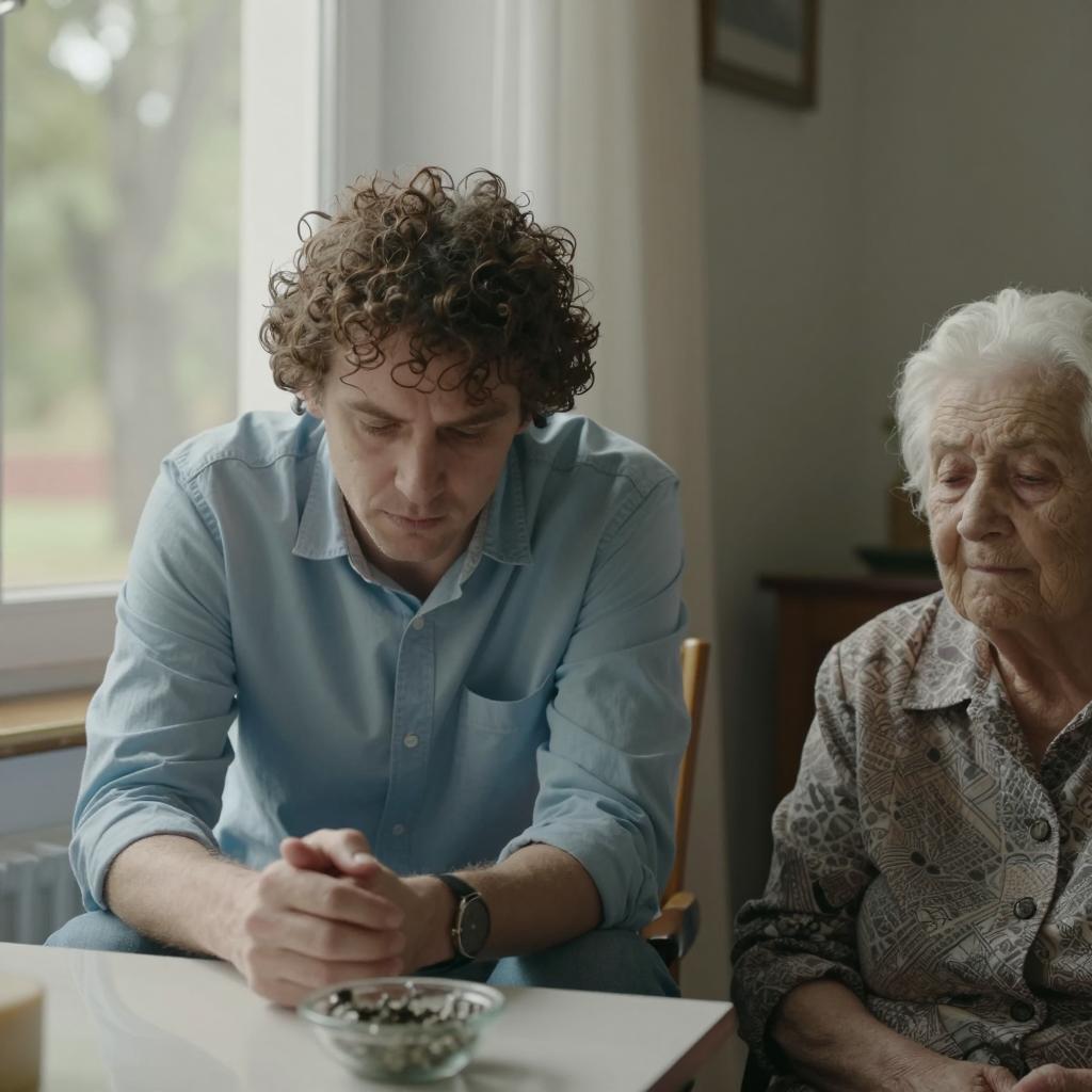 Older woman with short, light brown hair wearing a red shirt, looking down. She is on a small, vintage, black-and-gray television with numerous dials and buttons on the right side. The background is blurry and dark.