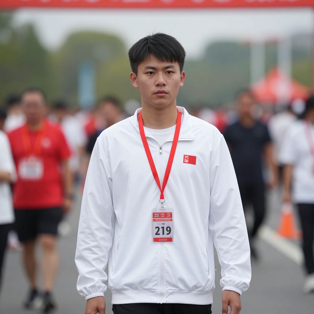 Race Day Costume, young man in a white jacket and a red lanyard