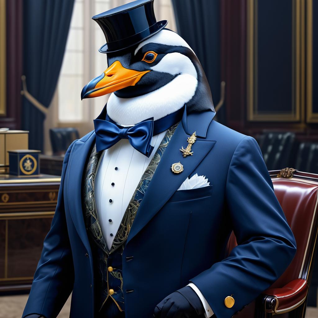 A highly detailed digital painting of a stern-looking penguin dressed as a diplomat in an elegant navy blue tuxedo with gold trim, a bow tie, and a patterned waistcoat. The penguin stands in a luxurious, classic room with rich wood paneling, ornate furniture, and a chandelier, embodying a refined and sophisticated atmosphere.