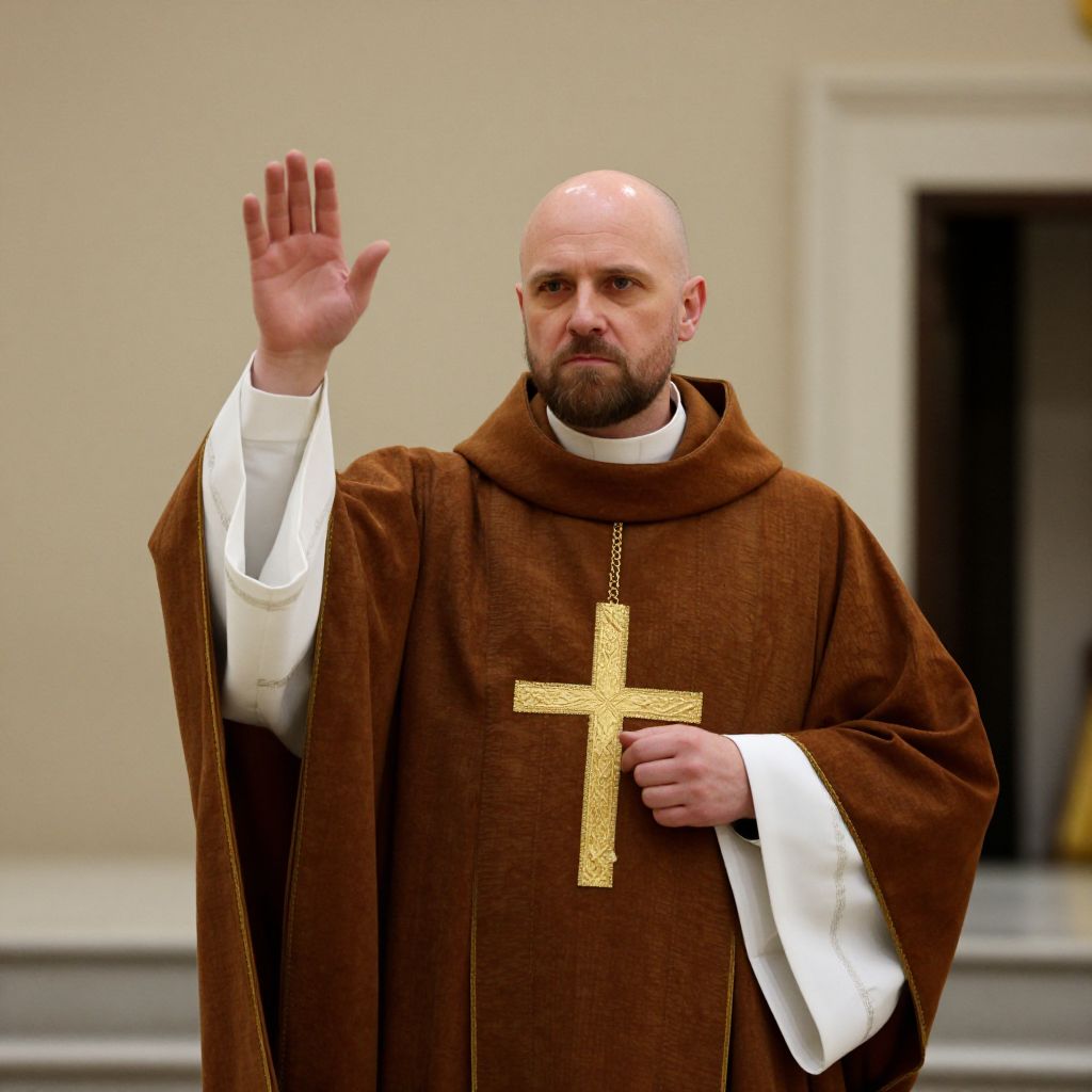 Photograph of a bald, bearded middle-aged man with a fair complexion, standing indoors. He's wearing a brown, velvet clerical robe over a white alb with gold trim and a gold cross on the chest. His right hand is raised in a wave. The background is a simple, beige-colored interior with steps and a doorway. He has a serious expression.