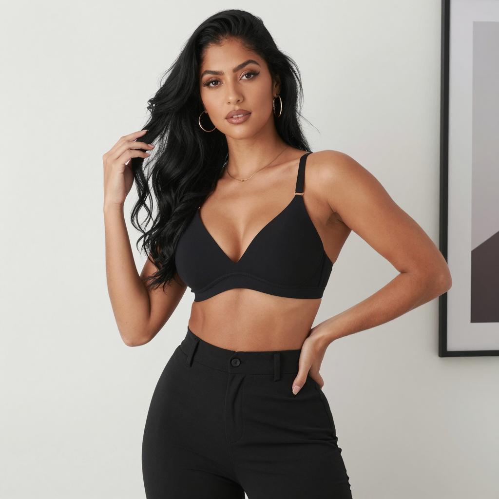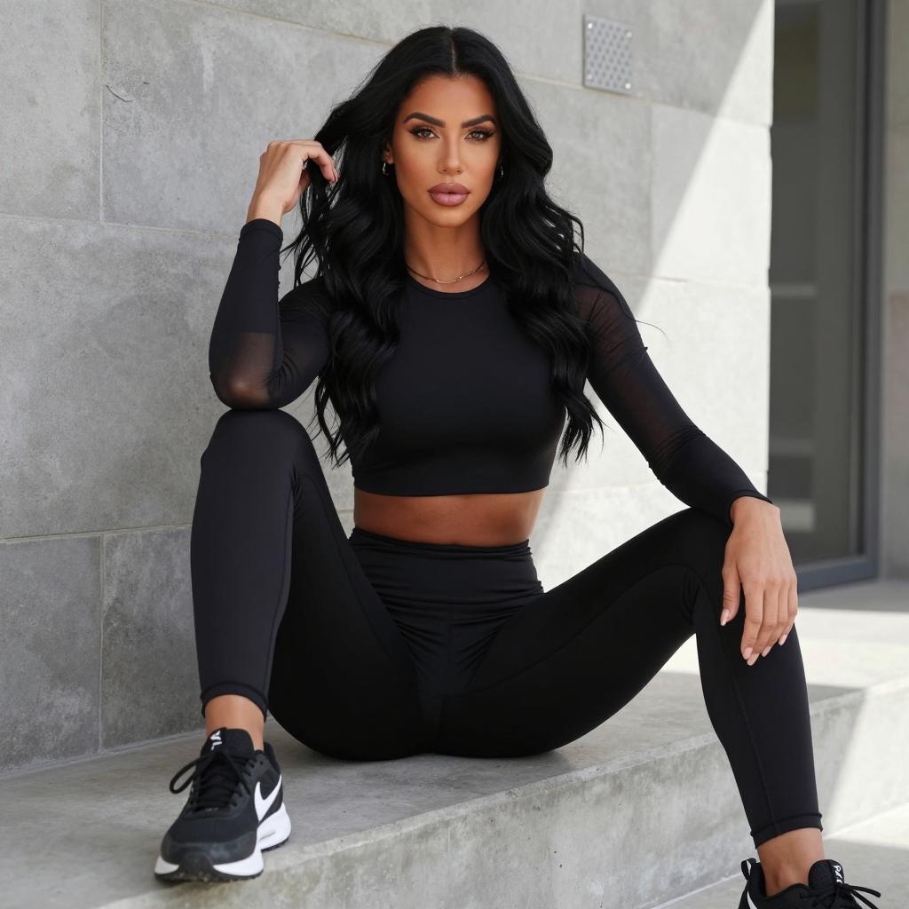 Blonde woman with straight hair, black headband, black sunglasses, black long-sleeve crop top, and black pants. Hands on hips. Standing in front of a dark blue door and a red column. Photo. Neutral facial expression. Full body. Urban setting.