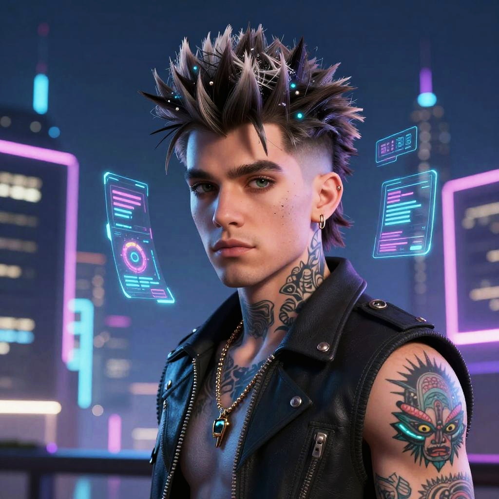 Bill Kaulitz AI character design, stylized in a futuristic world, spiky hair integrated with holographic interfaces, urban tech background, glowing tattoos and LED embedded skin, sharp detailed features, neon cityscape ambiance, high detail 3D render style
