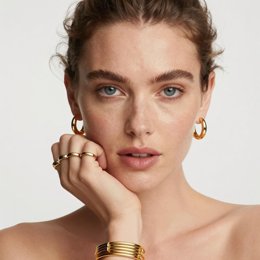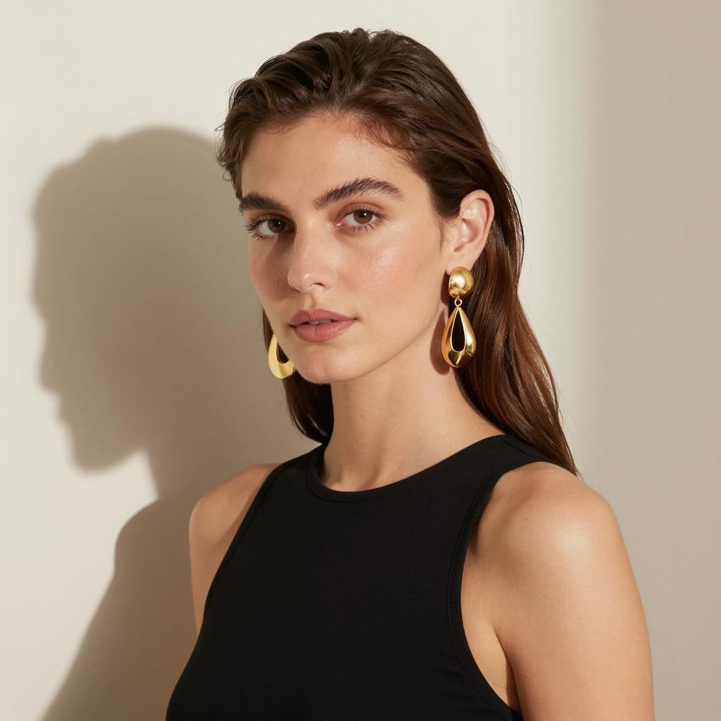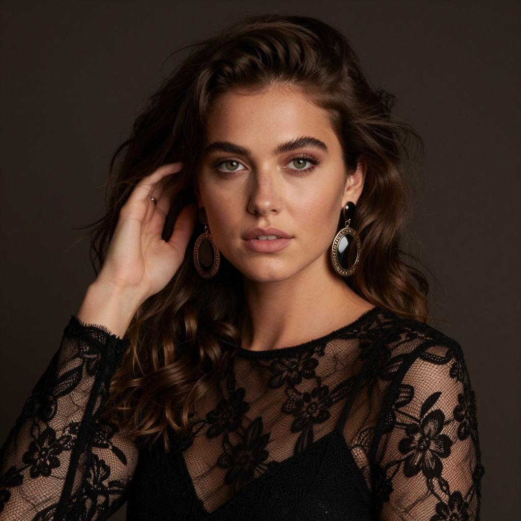 Photograph of a light-skinned woman with long, straight brown hair, blue eyes, and freckles. She wears large, white, fan-shaped earrings and a white, sleeveless top. She gazes slightly to the right with a neutral expression. The background is blurred with light colors. She is positioned slightly to the left, facing the camera. Sunlight illuminates her face.