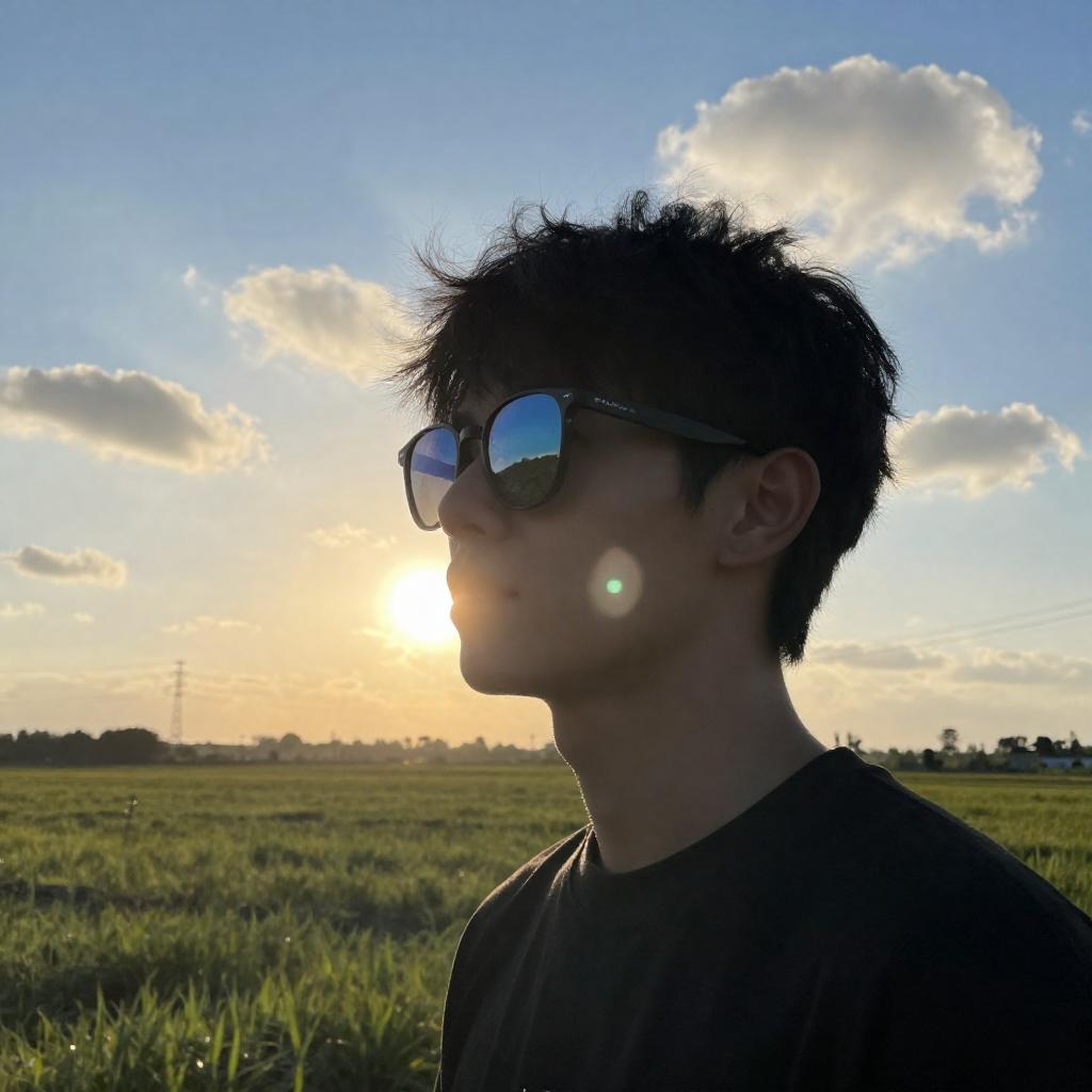Photograph of a person with dark, tousled hair and reflective sunglasses in the foreground, backlit by a setting sun. They are silhouetted against a grassy field with power lines and a distant horizon. The sky is blue with scattered clouds.
